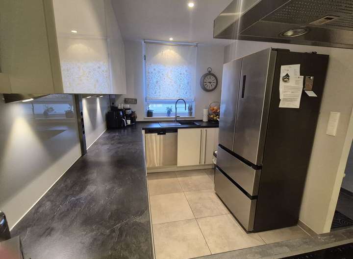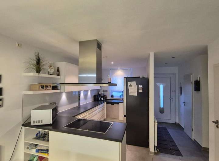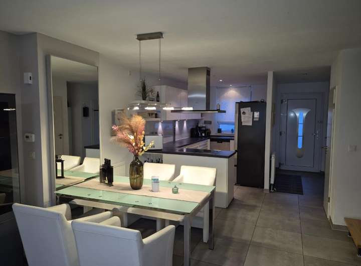 Bereits im Erdgeschoss empfängt Sie der offene und freundliche Wohn- und Essbereich, der das Herzstück des Hauses bildet. Große Fensterflächen sorgen für viel Tageslicht und einen direkten Zugang zur Terrasse – ideal für gesellige Abende oder entspannte Stunden im Freien. Die moderne Einbauküche fügt sich harmonisch ein und bietet alles, was Sie für den Alltag benötigen.