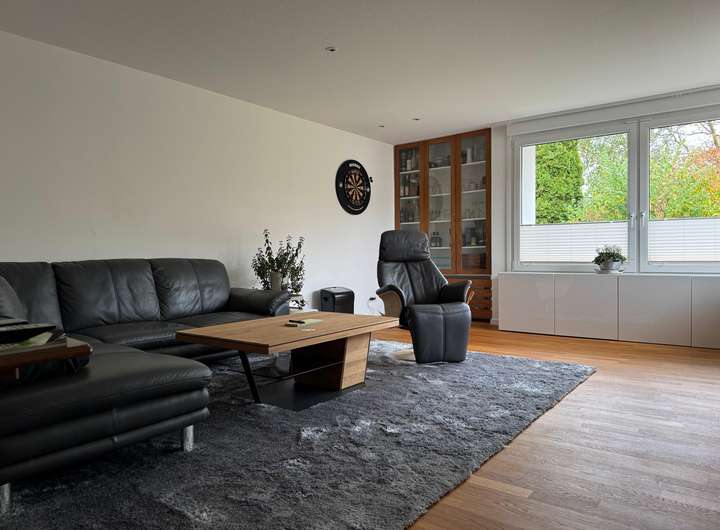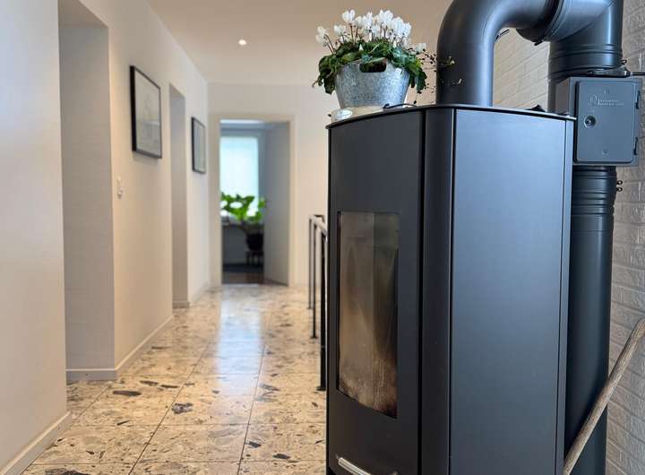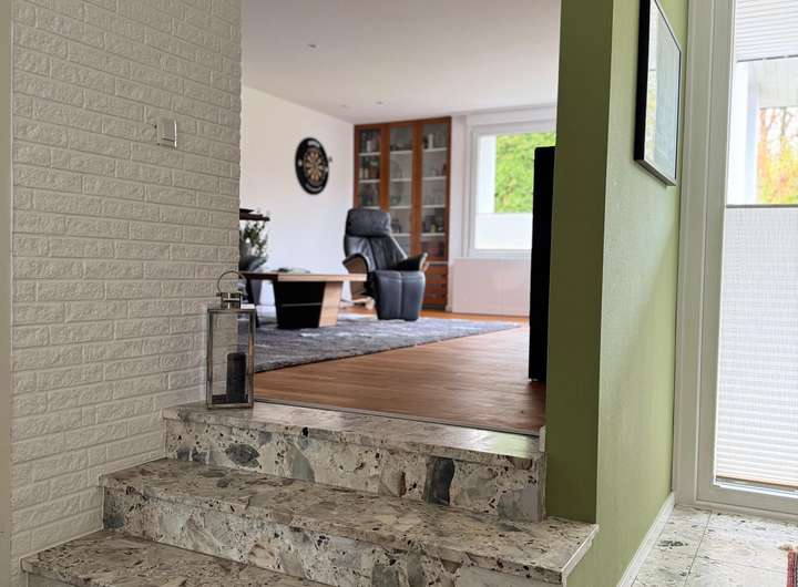 Ein besonderes architektonisches Highlight bildet das Split-Level zum Wohnzimmer. Der offene und lichtdurchflutete Wohnbereich hebt sich durch die erhöhte Lage optisch vom übrigen Wohnraum ab und schafft eine großzügige, einladende Atmosphäre. Der im Flur platzierte Kaminofen setzt nicht nur einen stilvollen Akzent, sondern sorgt in der kalten Jahreszeit zusätzlich für wohlige Wärme und Gemütlichkeit.