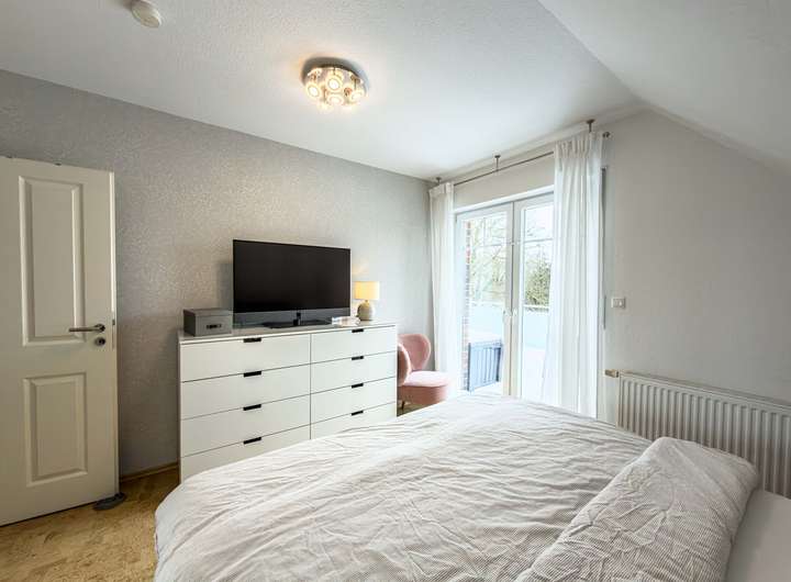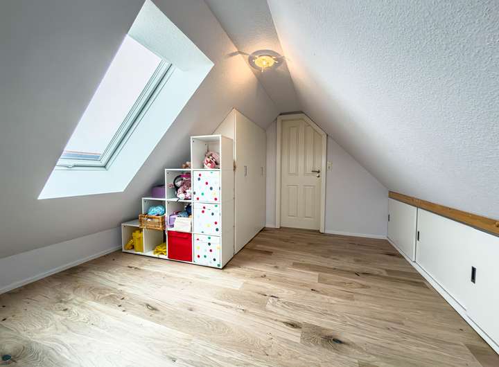 Der Wohnbereich bildet das Herzstück des Hauses und überzeugt durch seine helle, freundliche Gestaltung sowie den integrierten Kaminofen, der insbesondere in der kälteren Jahreszeit für eine behagliche Wohnatmosphäre sorgt. Großzügige Fensterflächen schaffen ein angenehmes Raumgefühl und verbinden den Innenbereich harmonisch mit den Außenflächen. Ergänzend steht ein ausgebautes Dachgeschoss zur Verfügung, das als Nutzfläche vielfältig genutzt werden kann – beispielsweise als Arbeitsbereich, Hobbyraum oder zusätzlicher Stauraum.