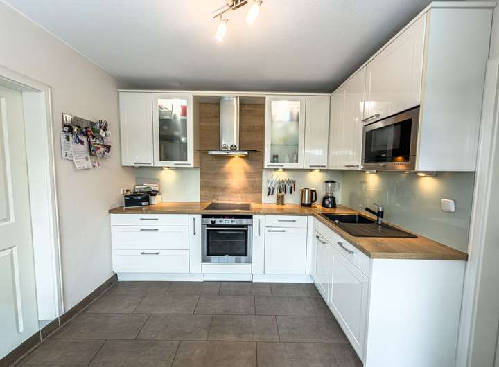Auch im Innenbereich überzeugt die Immobilie durch eine geschmackvolle Ausstattung. Zimmertüren im klassischen Landhaus-Stil verleihen den Räumen eine warme, wohnliche Note. Die Bodenbeläge bestehen aus einer harmonischen Kombination von Fliesen, Vinyl und Kork und sind sowohl pflegeleicht als auch langlebig. Die Treppenanlagen sind hochwertig ausgeführt: Eine massive Betontreppe mit edlen Parkettstufen führt in das erste Obergeschoss, während eine stabile Stahltreppe mit Parkettstufen den Zugang zum zweiten Obergeschoss ermöglicht.