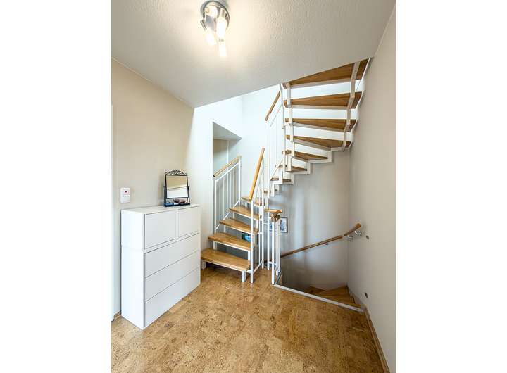 - Treppen: ins 1.OG Betontreppe mit Parkett-Stufen belegt, ins 2. OG feste Stahltreppe mit Parkett-Stufen
