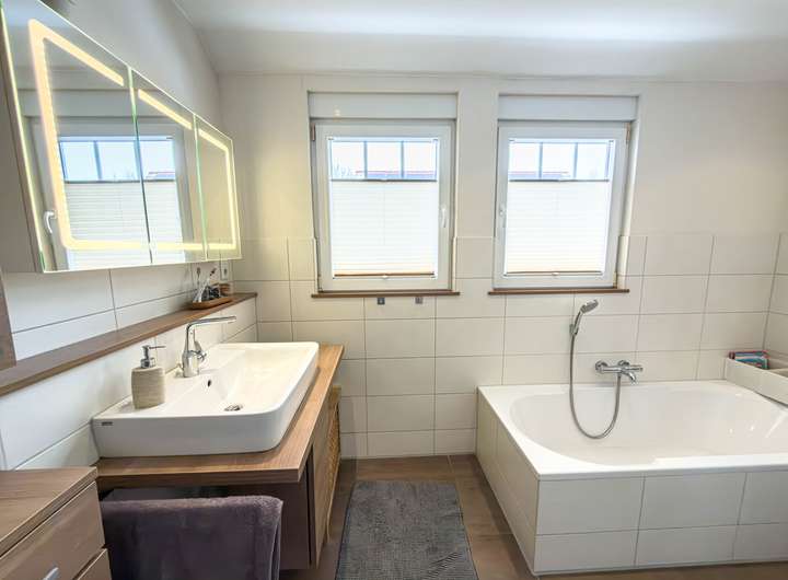 Das Haus ist mit weißen Kunststofffenstern ausgestattet, die zweifach verglast sind und über eine Wärmeschutzverglasung verfügen. Teilweise sind die Fenster mit abschließbaren Griffen versehen und bieten damit zusätzlichen Sicherheitskomfort. Außenrollläden, zum Teil elektrisch bedienbar, sowie hochwertige Plissees an ausgewählten Fenstern unterstreichen den hohen Wohnstandard. Die Beheizung erfolgt über eine Gas-Zentralheizung in moderner Brennwerttechnik. Ergänzend sorgen Wärmerückläufe in der Küche, im unteren Hausflur sowie im Badezimmer für eine effiziente und angenehme Wärmeverteilung.