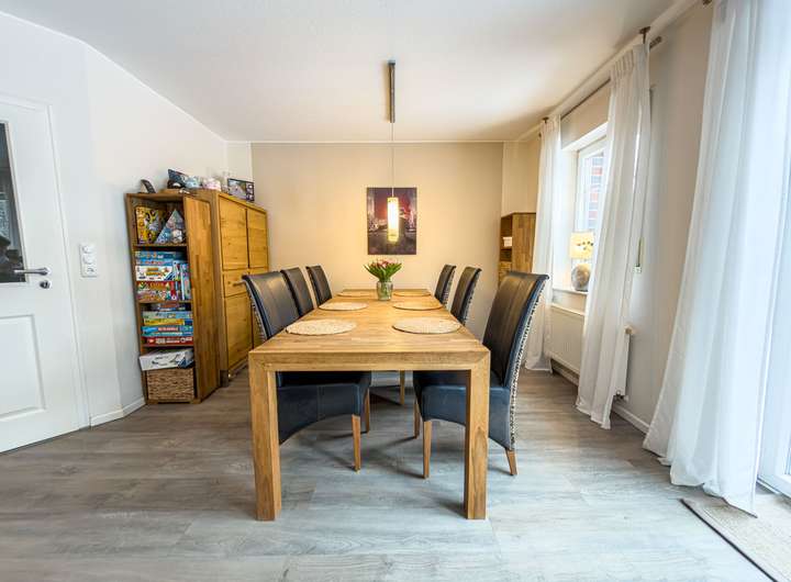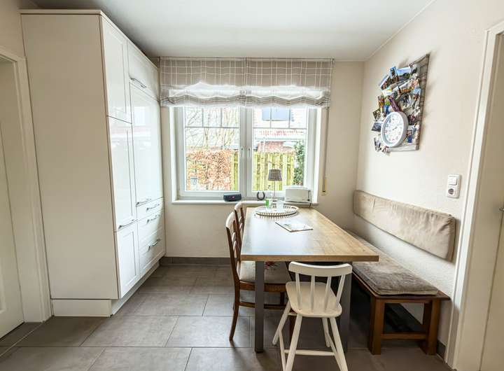 Die Küche ist mit einer hochwertigen Einbauküche des Herstellers Nobilia (Baujahr 2008) ausgestattet und verfügt über eine praktische Essecke, die kurze Wege und einen angenehmen Mittelpunkt für den Familienalltag bietet. Direkt angrenzend befindet sich ein Hauswirtschaftsraum, der nicht nur zusätzlichen Stauraum bietet, sondern auch einen direkten Zugang zum Carport ermöglicht – ein durchdachtes Detail, das den Alltag spürbar erleichtert. Ein Gäste-WC mit Fenster ergänzt das Raumangebot im Erdgeschoss sinnvoll.