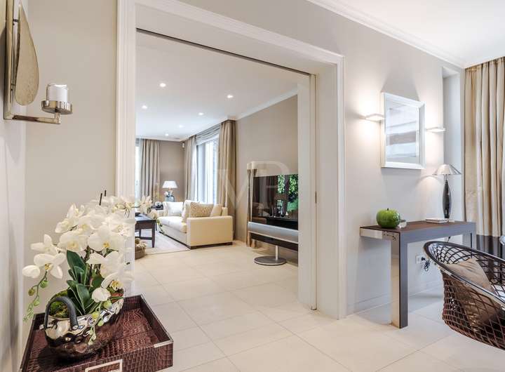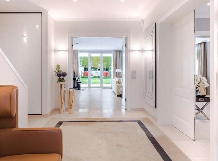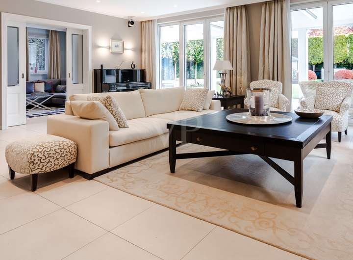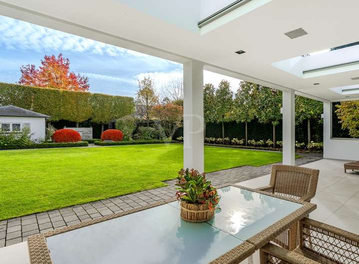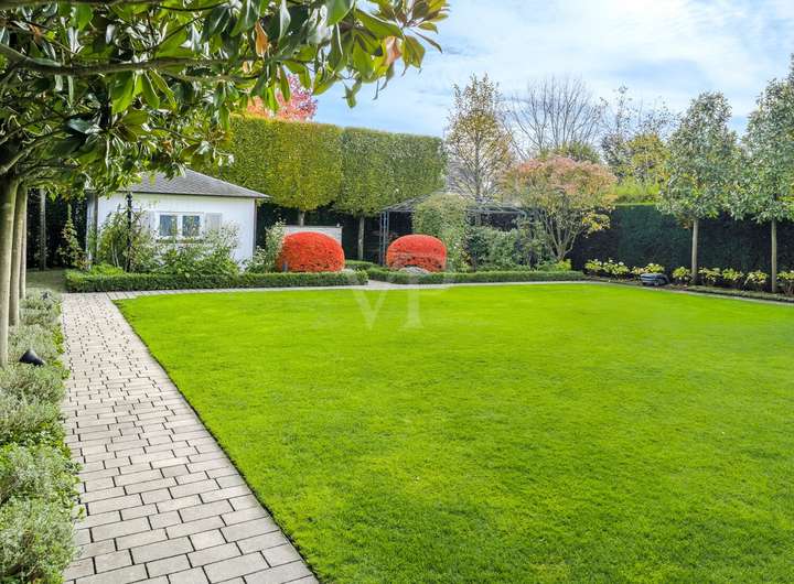 Ein elegantes Entrée, großzügige Wohn- und Essräume mit Holzkamin und raumhohen Flügeltüren, eine Bibliothek sowie eine überdachte Terrasse mit Oberlichtern bieten direkten Zugang in den wundervoll angelegten Garten mit seltenen Pflanzen, Wasserspiel und Rosenpavillon. Auch hier zeigt sich der hohe Pflege- und Ausstattungsstandard, der sich konsequent durch das gesamte Anwesen zieht.