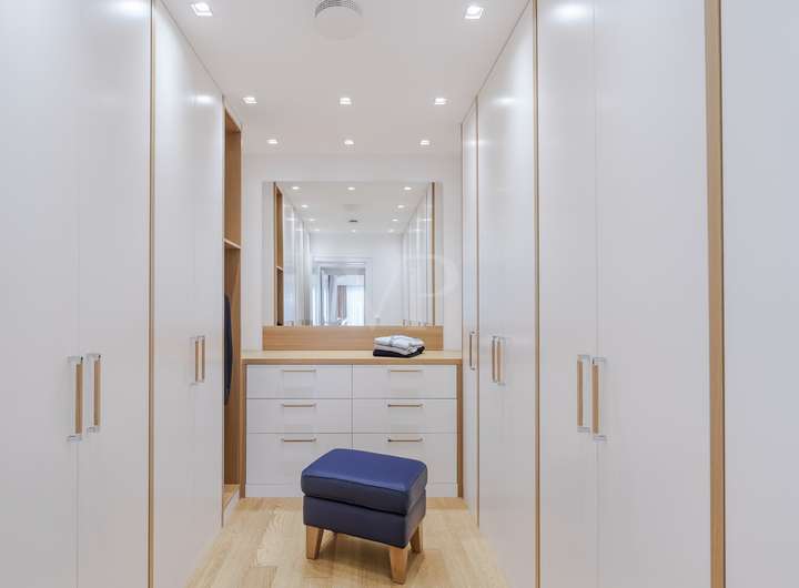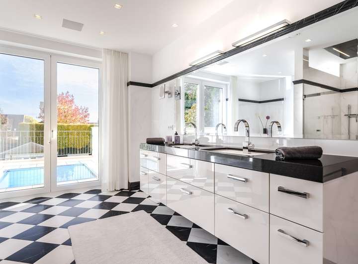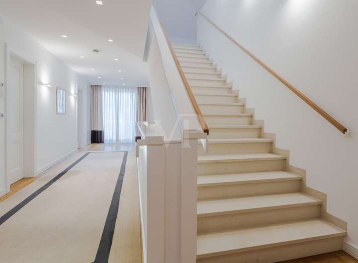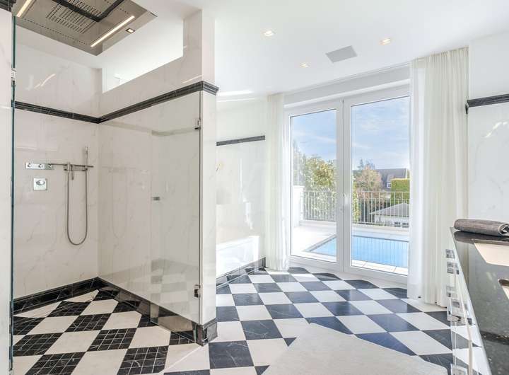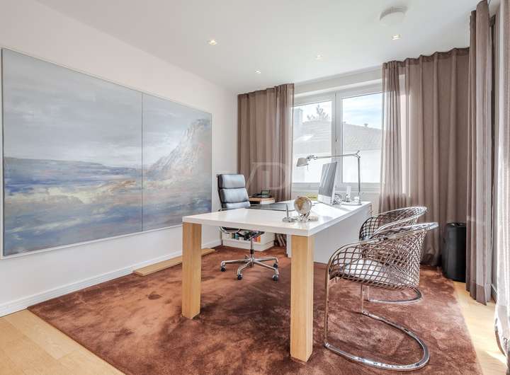 Im Obergeschoss befinden sich vier klimatisierte Schlafzimmer mit zwei stilvollen Tageslichtbädern und einem 44 m² großen Süd-/Ost-Balkon mit Blick auf das schöne Grundstück. Eine großzügige Ankleide, maßgefertigte Einbauten auf der gesamten Etage sowie ein perfekt ausgestatteter Hauswirtschaftsraum, der auch als weiteres Schlafzimmer dienen könnte, erfüllen höchste Ansprüche an komfortables Wohnen.