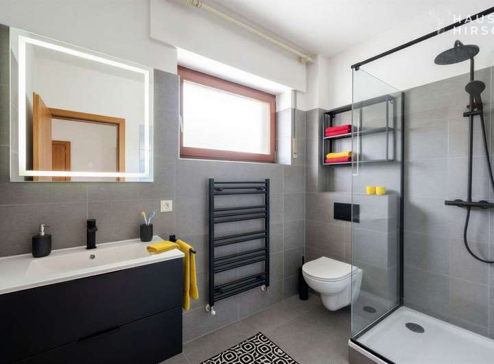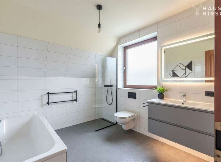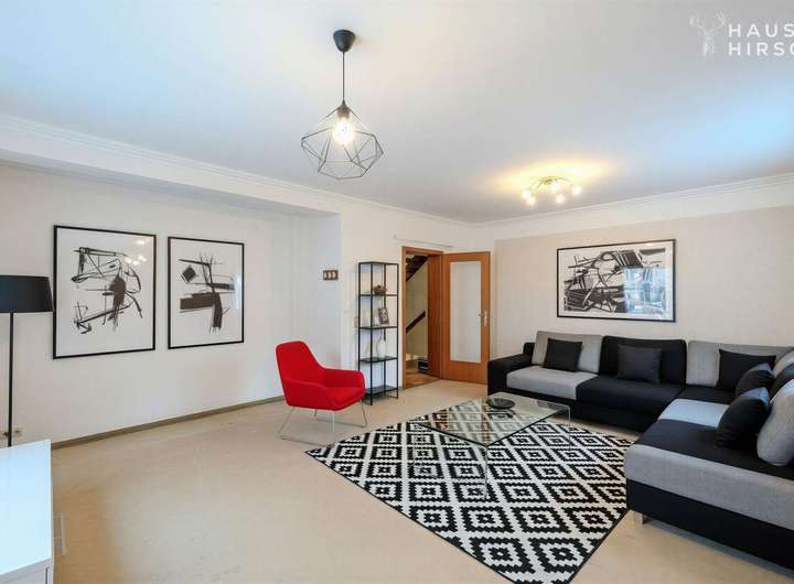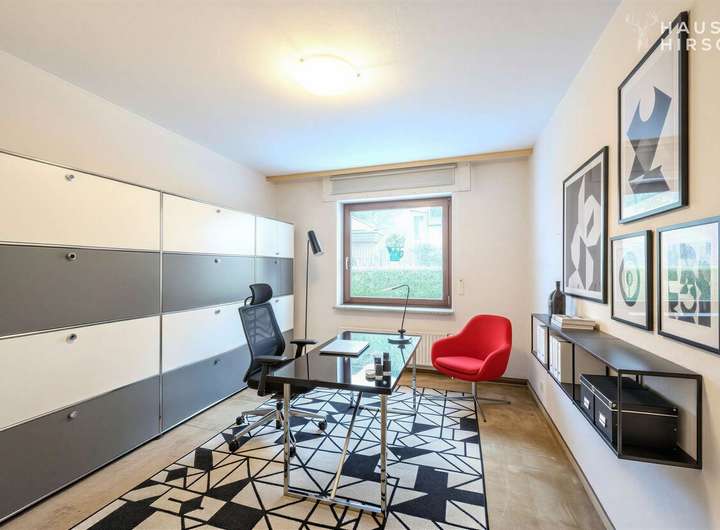 Das Erdgeschoss bildet das Herzstück des Hauses mit einem lichtdurchfluteten Wohnbereich, der einen direkten Zugang zur ca. 60 m² großen Terrasse und dem weitläufigen Garten bietet. Ergänzt wird diese Ebene durch eine Küche, ein praktisches Büro sowie ein Gäste-WC und ein Badezimmer. Im Obergeschoss befinden sich zwei Schlafzimmer, die ausreichend Rückzugsmöglichkeiten bieten, sowie ein zweites Badezimmer. Zusätzliche Nutzfläche steht im Keller sowie in einem Abstellraum zur Verfügung. Die Beheizung erfolgt über eine Öl-Heizung, deren Anlagentechnik im Jahr 2011 modernisiert wurde.
