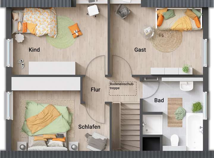 Das Flair 113 ist nicht ohne Grund das meistgekaufte Town & Country Haus. Es bietet alles, was ein Massivhaus gemütlich macht. Im Erdgeschoss betreten Sie ein geräumiges Wohn- und Esszimmer, eine Küche mit genügend Freiraum, ein Gäste-WC und einen Hauswirtschaftsraum mit ausreichend Platz für Waschmaschine und Co. Im Dachgeschoss erwarten Sie neben drei weiteren geräumigen Zimmern ein komfortabel ausgestattetes Badezimmer.