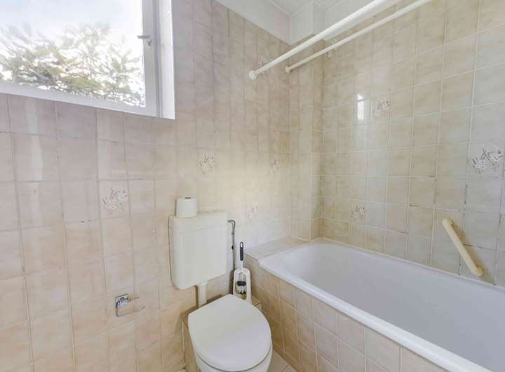 Das Badezimmer wurde mit Wanne, WC und Waschbecken ausgestattet. Sowohl das Bad als auch das Gäste-WC verfügen über Tageslicht, sind jedoch deutlich in die Jahre gekommen und sollten modernisiert werden.