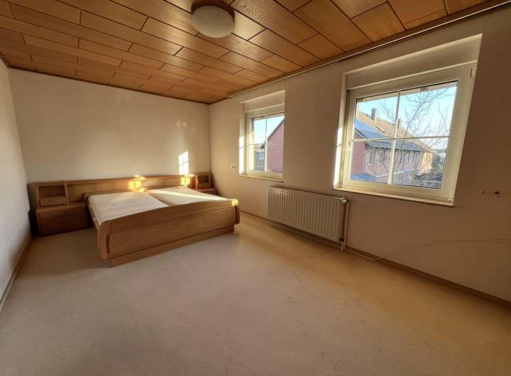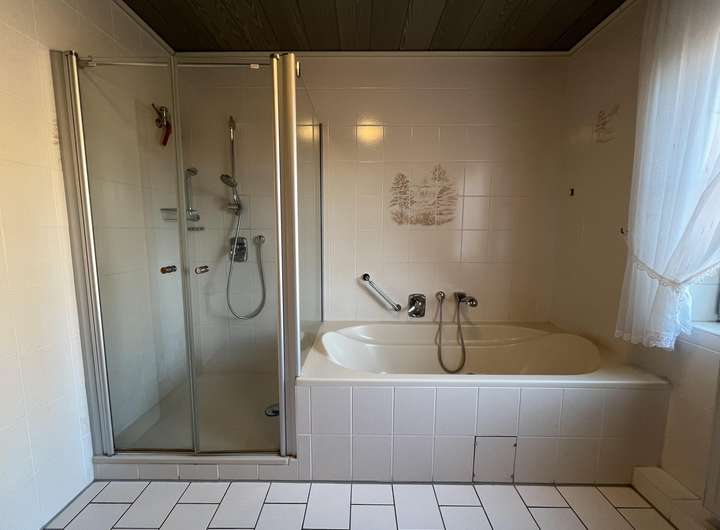 Im Obergeschoss befinden sich zwei Schlaf-/Kinderzimmer sowie ein geräumiges Bad mit Dusche und Badewanne.
