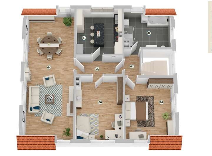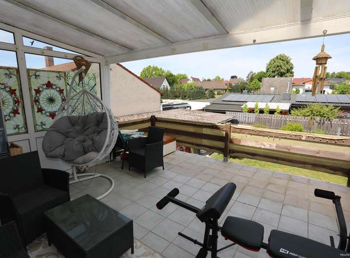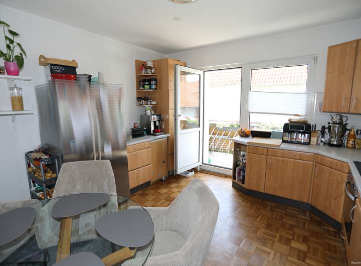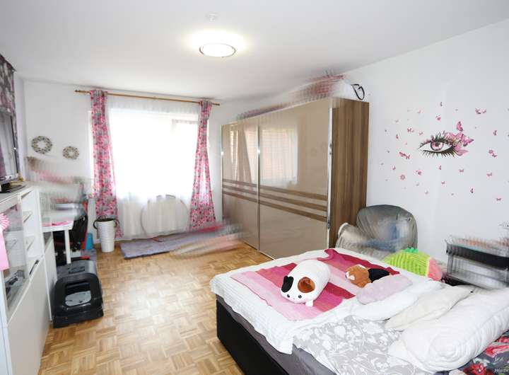 Im Obergeschoss gibt es neben dem Wohn- und Essbereich noch bis zu 3 Schlafzimmer. Ein Zimmer hat einen Ausgang auf den teil überdachten großen Balkon. Die Küche ist großzügig und hat Platz für einen Sitzbereich. Zudem hat die Küche ebenfalls einen Ausgang auf einen kleinen Balkon. Das Tageslichtduschbad ist hell gefliest. Hier können auch die Waschmaschine und der Trockner stehen.