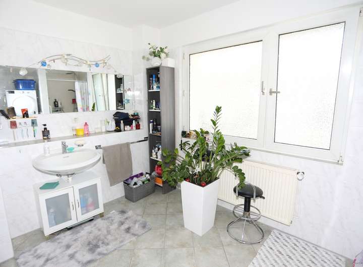 Das Tageslichtbad verfügt über eine Badewanne und eine Dusche und bietet Stellplätze für die Waschmaschine und den Trockner.