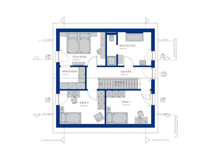 Der Grundriss des EVOLUTION 136 überzeugt durch eine durchdachte Raumaufteilung, die sowohl für Familien als auch für Paare ideal ist. Mit insgesamt fünf Zimmern, verteilt auf zwei Etagen, haben Sie zahlreiche Möglichkeiten, jeden Raum individuell zu gestalten. Das Erdgeschoss ist der perfekte Ort für gesellige Stunden mit der Familie oder Freunden, während im Obergeschoss die Rückzugsmöglichkeiten für jeden Bewohner geschaffen werden. Hier erleben Sie eine angenehme Privatsphäre, die es Ihnen ermöglicht, ganz nach Ihren Bedürfnissen zu wohnen und zu leben. Besondere Komfortdetails wie die lichtdurchfluteten Räume und die stilvolle Gestaltung der geradläufigen Treppe machen Ihr Zuhause zu einem Ort des Wohlfühlens. Der großzügige Wohnbereich bietet Ihnen Platz für gemütliche Abende, während die angrenzende Küche für kulinarische Abenteuer einlädt. Ein zusätzlicher Abstellraum sorgt dafür, dass Sie genügend Stauraum für Ihre persönlichen Dinge haben, sodass Ihr Wohnraum stets aufgeräumt bleibt. Die geschickte Platzierung der Fenster lässt viel Tageslicht herein und sorgt für eine freundliche Atmosphäre, die Ihr Zuhause lebendig macht. Die Ausbaustufe, in der Ihr neues Zuhause erbaut wird, ist schlüsselfertig, was Ihnen den Vorteil gibt, dass Sie sich um nichts kümmern müssen. Bien-Zenker übernimmt den gesamten Bauprozess für Sie und sorgt dafür, dass alle Arbeiten nach hohen Qualitätsstandards erfolgen. Dies bedeutet, dass Sie ein Zuhause erhalten, das nicht nur optisch ansprechend, sondern auch nachhaltig ist. Sie können sich entspannt zurücklehnen und darauf freuen, in Ihr neues Zuhause einzuziehen, während Bien-Zenker alles für Sie organisiert und umsetzt.