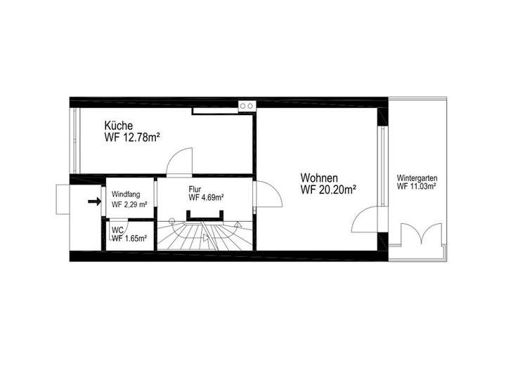 Im Erdgeschoss befinden sich der Windfang, der Flur, eine eingebaute Küche, das lichtdurchflutete Wohnzimmer und der beheizte Wintergarten. Ein Gäste-WC rundet das Erdgeschoss ab. Der Untergeschossbereich umfasst einen Heizungsraum, eine Waschküche und den Keller, der für diverse Zwecke genutzt werden kann.
