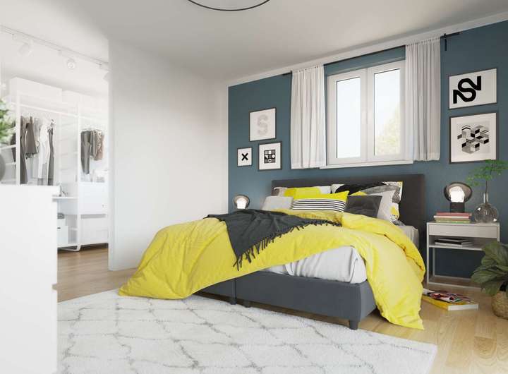 Unsere große Stadtvilla Flair 152 spiegelt mit seinen klaren Linien das urbane Lebensgefühl seiner Bewohner wieder. Sie überzeugt mit einem cleveren Grundriss und einer schicken, modernen Optik. Zentrum des Familienlebens ist das helle und geräumige Wohnzimmer mit gemütlichem Essbereich. Von hier aus können Sie direkt in die offene Küche blicken und schauen, was in den Töpfen köchelt. In der Küche haben Sie genug Platz für gemeinsame Kochabende mit den Liebsten oder ein schnelles Frühstück unter der Woche. Wer hin und wieder lieber im Home-Office arbeitet, kann sich neben dem Wohnzimmer ein großzügiges Arbeitszimmer einrichten. Auch das Obergeschoss zeigt sich im gradlinigen Baustil des Hauses. Hier finden Sie ein Schlafzimmer mit geräumiger Ankleide und wahlweise zwei oder drei zusätzliche Zimmer (6 Zimmer möglich), die Sie nach Ihren Vorstellungen als Schlaf-, Kinder- oder Gästezimmer nutzen können. Große Fenster lassen auch hier viel Tageslicht hineinströmen. Das Stadthaus Flair 152 ist gradlinig und schick – einfach optimal für das moderne Wohnen in Stadtnähe.