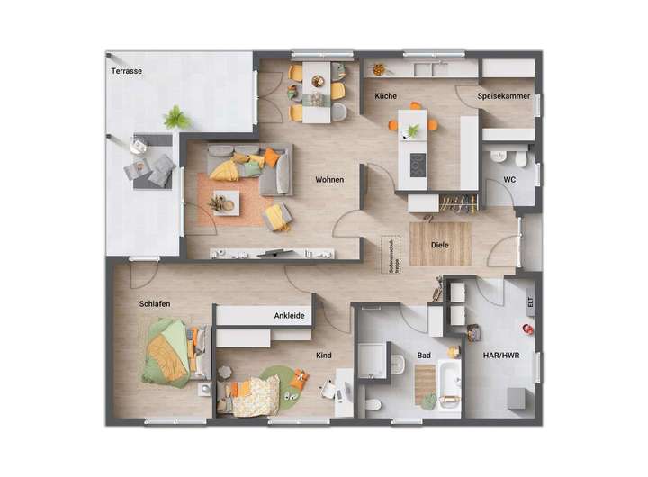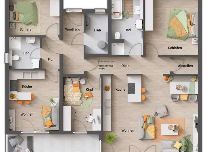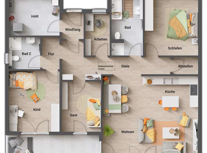 • Fußbodenheizung: Warme Füße? Auch die Fußbodenheizung ist inklusive. Sie steigert nicht nur den Wert Ihres Hauses, sondern sorgt ganz nebenbei noch für echtes Wohngefühl.