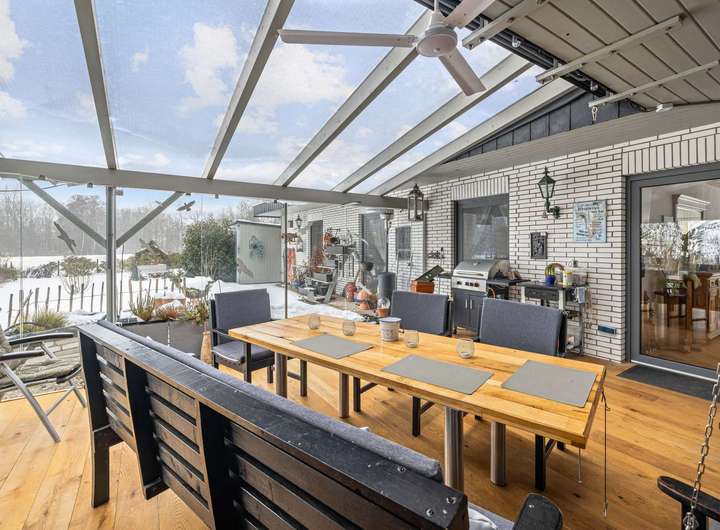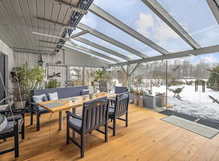 Der großzügige Wintergarten mit automatischer Markise lockt als Pflanzenparadies und lädt zu geselligen Rommé-Abenden mit entspannten Sonnenuntergängen ein. Der idyllische Garten wird durch ein Bewässerungssystem und einen Mähroboter gepflegt. Ein eigener Brunnen stellt die Wasserversorgung sicher.🌿