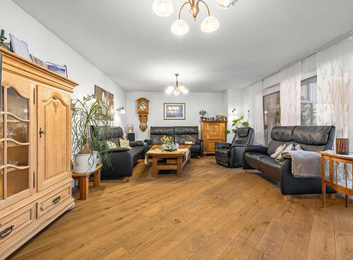 Das Gebäude überzeugt durch eine durchdachte Architektur und weist bis heute seine besonderen zeitlosen Qualitäten auf. Die L-Form bildet einen geschützten Garten-/ Terrassenbereich, der von Wohn- und Schlafräumen gefasst wird. Der Wohnbereich und drei Schlafzimmer öffnen sich direkt ins Grüne. Die ebenerdige Bauweise verspricht Barrierefreiheit und Inklusion. 🛋️