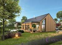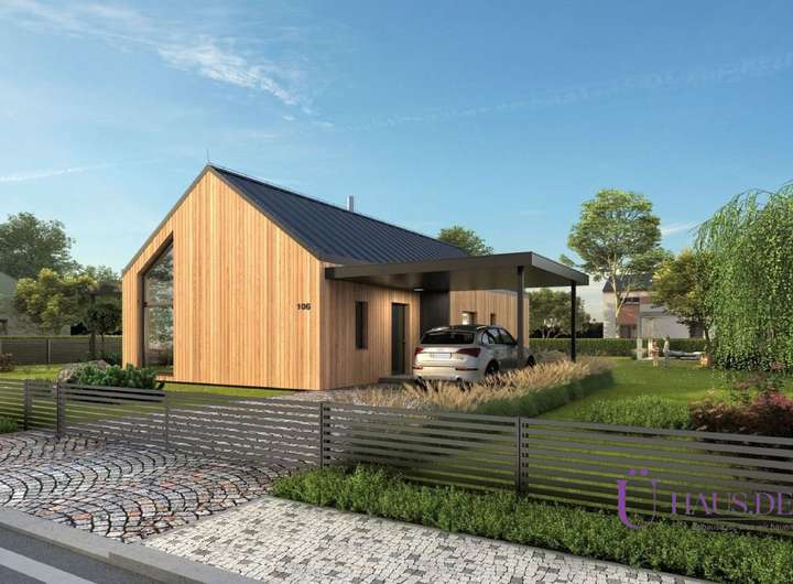 Von außen beeindruckt das moderne Dach ohne Überlappungen, das die klaren, schlichten Linien des gesamten Hauses unterstreicht . Eine noch stärkere Verbindung zur Natur gewährleisten die Holzfassade und die großen Fenster , die den gesamten Innenraum beleuchten und einen ruhigen Blick in den Garten ermöglichen. Das attraktive Design des Hauses wird durch eine Terrasse oder Pergola ergänzt, die auch als Garage genutzt werden kann.
