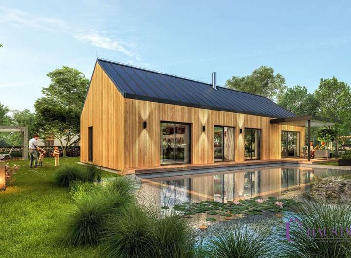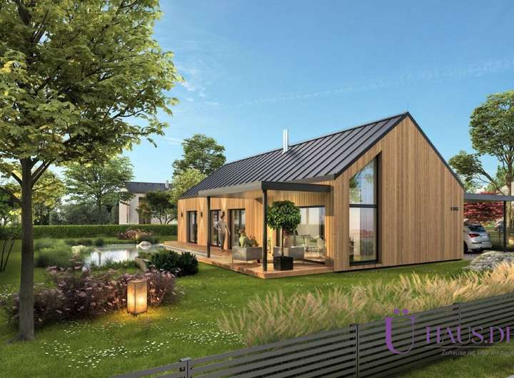 Von außen beeindruckt das moderne Dach ohne Überlappungen, das die klaren, schlichten Linien des gesamten Hauses unterstreicht . Eine noch stärkere Verbindung zur Natur gewährleisten die Holzfassade und die großen Fenster , die den gesamten Innenraum beleuchten und einen ruhigen Blick in den Garten ermöglichen. Das attraktive Design des Hauses wird durch eine Terrasse oder Pergola ergänzt, die auch als Garage genutzt werden kann.