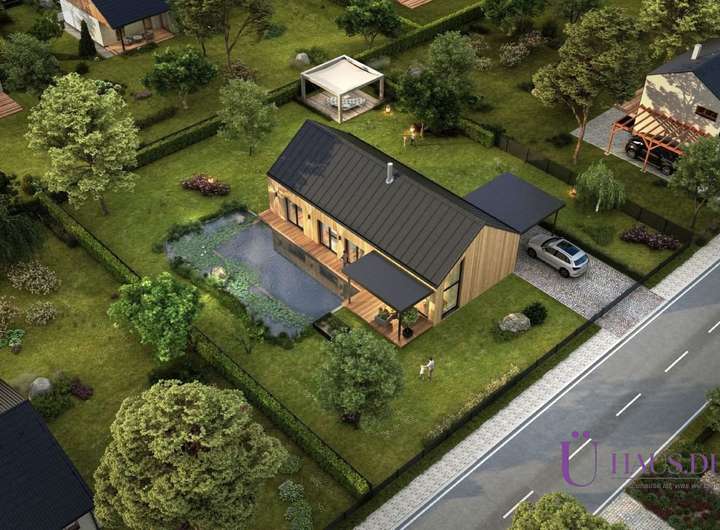 Von außen beeindruckt das moderne Dach ohne Überlappungen, das die klaren, schlichten Linien des gesamten Hauses unterstreicht . Eine noch stärkere Verbindung zur Natur gewährleisten die Holzfassade und die großen Fenster , die den gesamten Innenraum beleuchten und einen ruhigen Blick in den Garten ermöglichen. Das attraktive Design des Hauses wird durch eine Terrasse oder Pergola ergänzt, die auch als Garage genutzt werden kann.