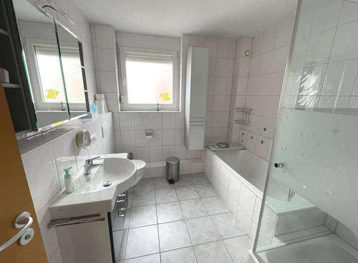 + Großzügiges Tageslicht-Badezimmer mit Badewanne, Glas-Duschkabine, Waschtisch, WC