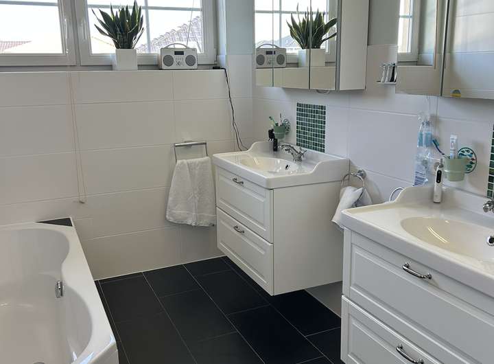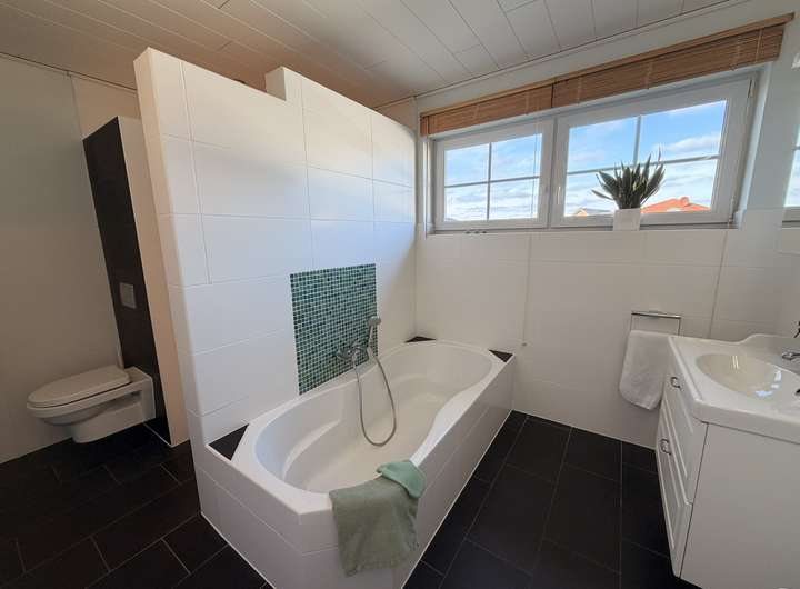 Komplettiert wird das Obergeschoss durch ein großzügiges Badezimmer mit XXL Dusche, Badewanne und zwei Waschtischen.