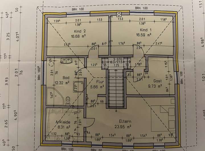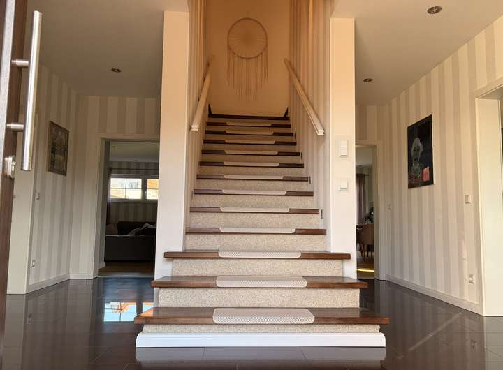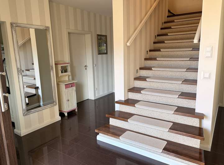 Beim Betreten des Hauses, fällt zunächst die zentrale Treppe auf. Diese teilt das Obergeschoss in zwei Flügel und verleiht dem Flur im Erdgeschoss einen besonderen Schnitt.