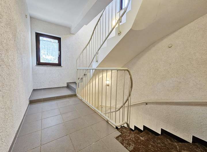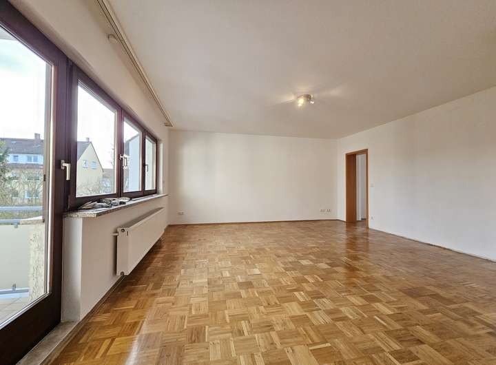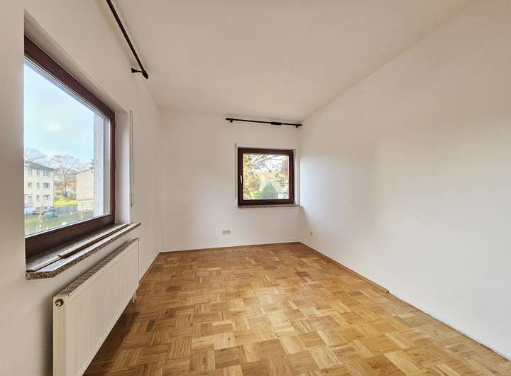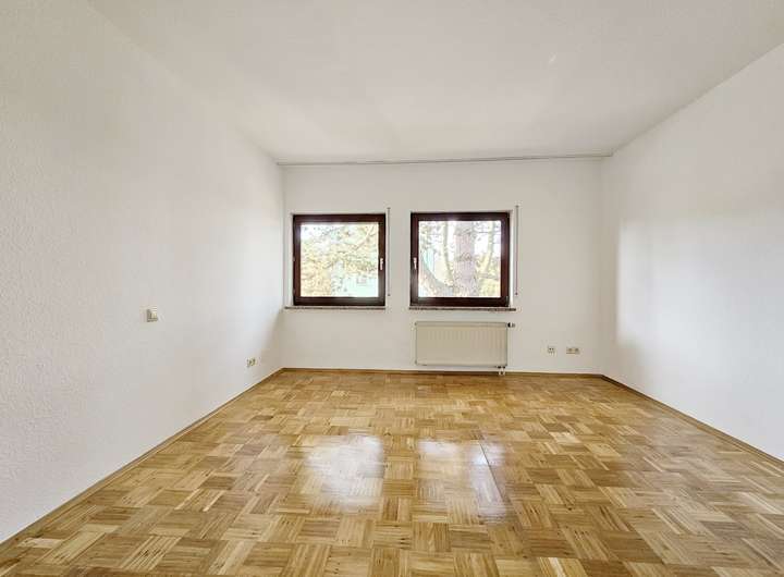 Die Drei-Zimmer-Wohnung im ersten Obergeschoss verfügt über einen Balkon sowie ein Gäste-WC. Alle Räume sind gut proportioniert, lichtdurchflutet und ebenfalls mit gepflegtem Parkettboden ausgestattet. Der Grundriss bietet ideale Voraussetzungen für Paare oder Familien.