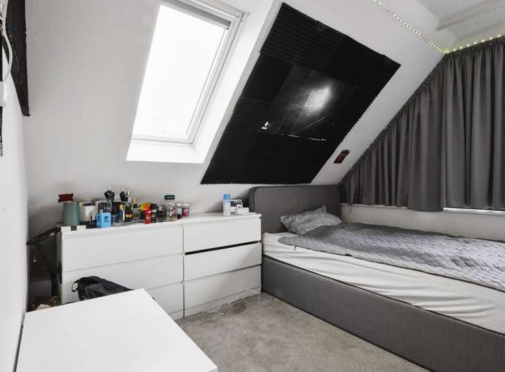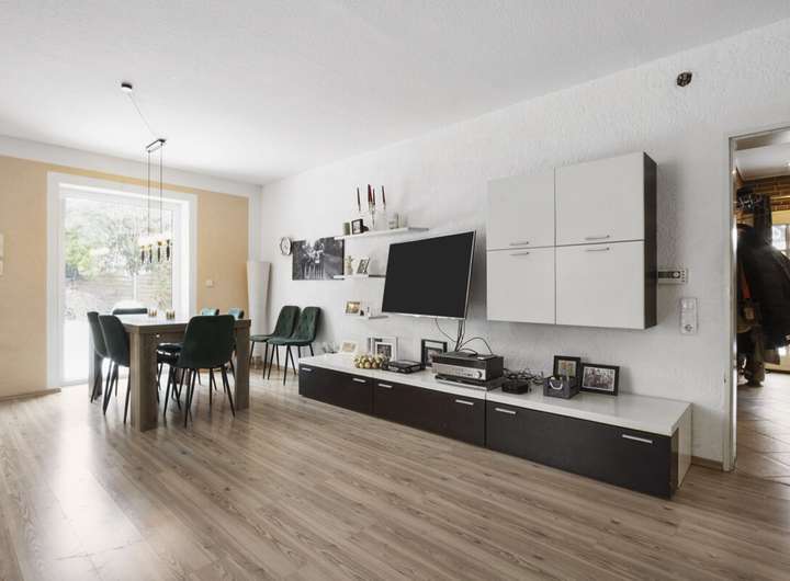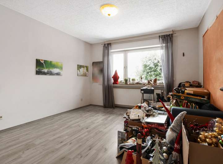 Der Zugang erfolgt über eine lange Einfahrt (Überwegungsrecht für das vordere Grundstück vorhanden). Im Erdgeschoss erwarten Sie zwei Schlafzimmer, ein Büro, ein großzügiges Wohn- und Esszimmer mit Zugang zur teilüberdachten Terrasse und in den Garten, eine Küche mit Einbauküche, ein Hauswirtschaftsraum mit Seiteneingang, ein Abstellraum, ein Vollbad sowie ein Gäste-WC.