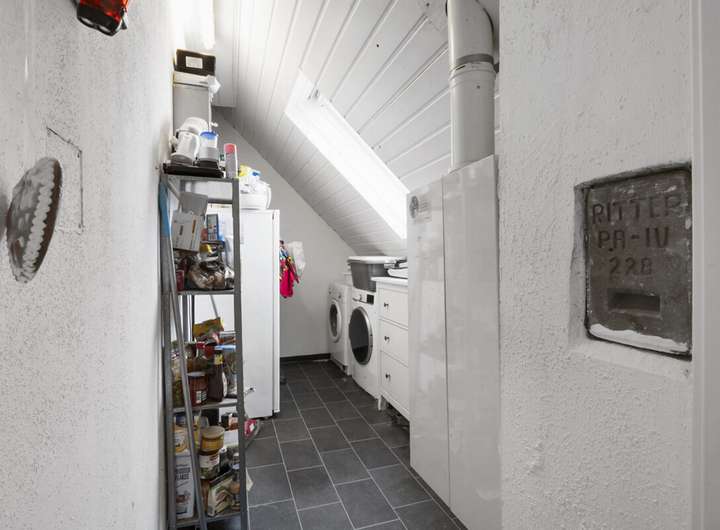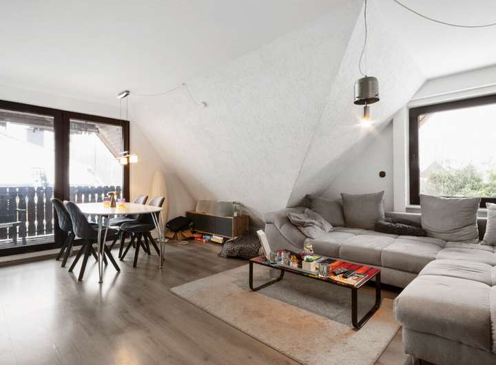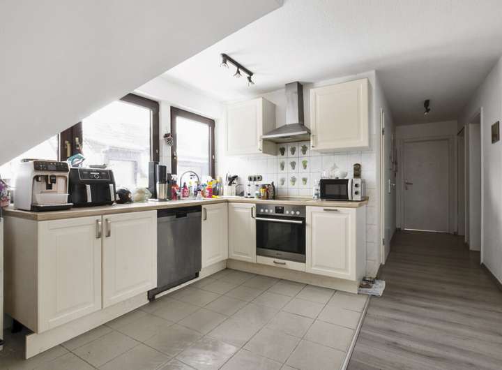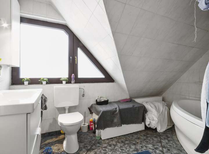 Über den Küchenbereich gelangen Sie ins Obergeschoss. Hier befinden sich ein offener Flur mit integrierter Küche, ein geräumiges Wohnzimmer mit Zugang zur Loggia, drei Schlafzimmer, ein Wannenbad mit Fenster sowie ein Abstellraum mit Zugang zum isolierten Dachboden.