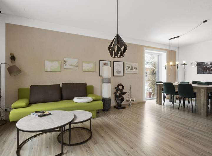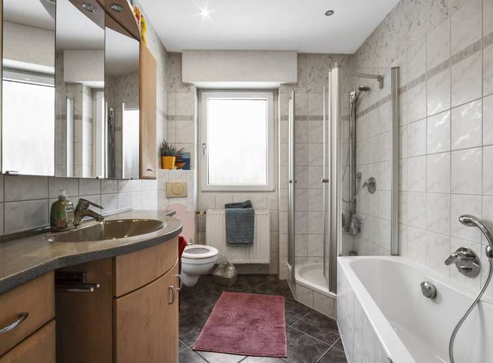 Die Wohnfläche verteilt sich auf ca. 114m² im Erdgeschoss und ca. 100m² im Obergeschoss. Beide Ebenen verfügen über jeweils vier Zimmer, Küche und Bad und eignen sich ideal für Mehrgenerationenwohnen oder die Kombination aus Eigennutzung und Vermietung.