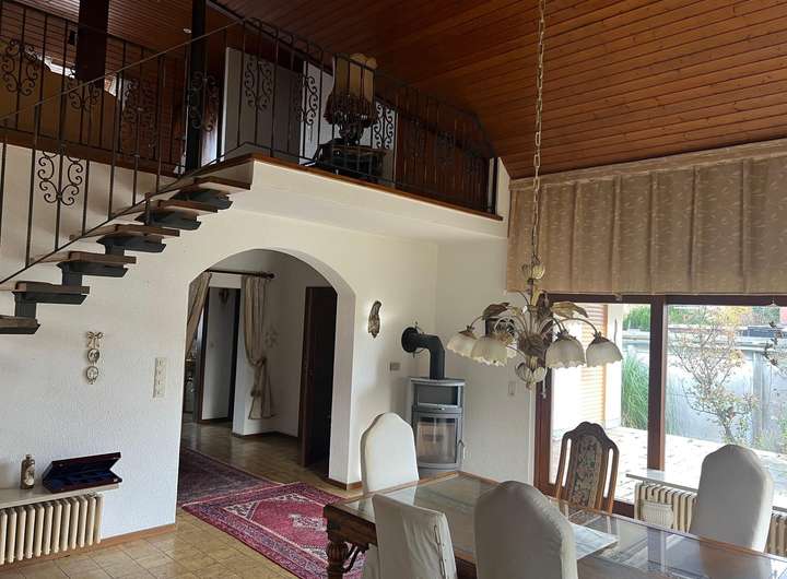 Ein repräsentativer Eingangsbereich führt in das lichtdurchflutete Galerie-Wohnzimmer mit Speckstein-Kaminofen. Die Küche mit einer neuwertigen Einbauküche im Wert von ca. 8.500,- €, ein Gäste- oder Hauswirtschaftszimmer sowie der Schlaf- und Studiobereich mit zusätzlichem Zimmer und separater Toilette bieten vielseitige Nutzungsmöglichkeiten.