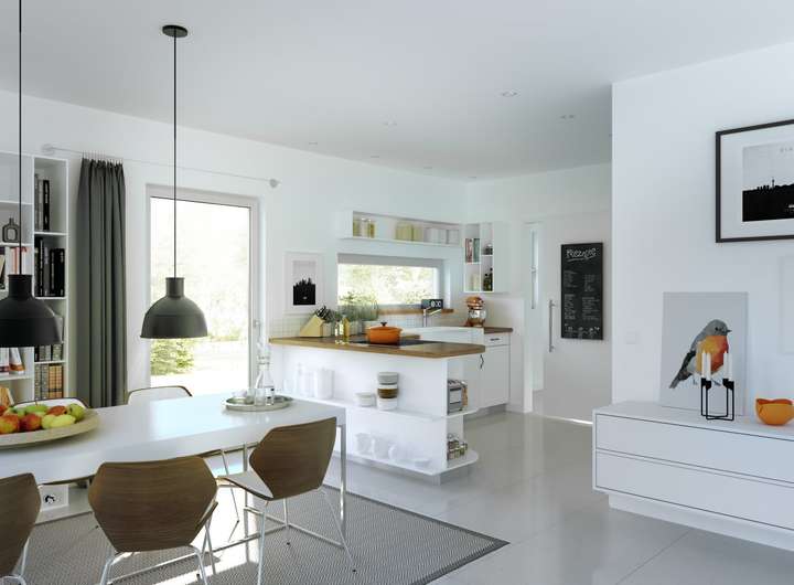 Dieses Fertighaus besticht durch eine umfangreiche Ausstattung, die keine Wünsche offenlässt. Die Grundausstattung umfasst moderne Böden, edle Innentüren und stilvolle Sanitäranlagen, die optimal aufeinander abgestimmt sind. Zudem erhältst du eine hochwertige Traumküche, die passgenau für dein Zuhause geplant wird.