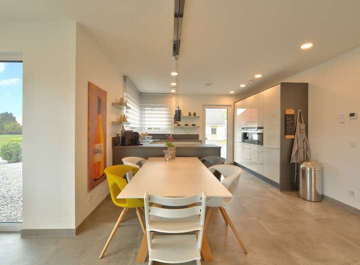 Das Einfamilienhaus von LivingHaus überzeugt durch eine umfangreiche Ausstattung, die keine Wünsche offenlässt. Du erhältst eine hochmoderne Traumküche, die perfekt auf deinen Grundriss abgestimmt ist und mit modernster Technik sowie cleveren Stauraumlösungen begeistert. Das Zuhause-Paket beinhaltet bereits eine hochwertige Grundausstattung mit stilvollen Sanitäranlagen, edlen Türen und modernen Böden. Zudem profitierst du von der innovativen I-KON-Lösung, die umweltfreundliches und energieeffizientes Bauen ermöglicht.
