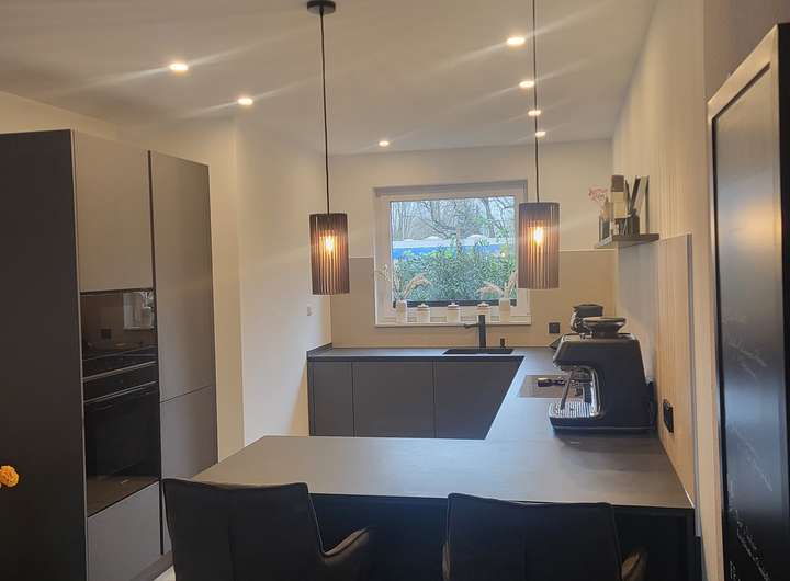Ein besonderes Highlight ist die exklusive Designküche von Häcker (Baujahr 2024), die mit hochwertigen Geräten und stilvollem Erscheinungsbild überzeugt.