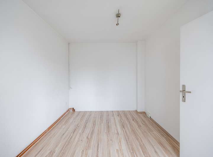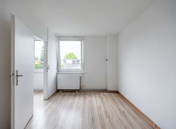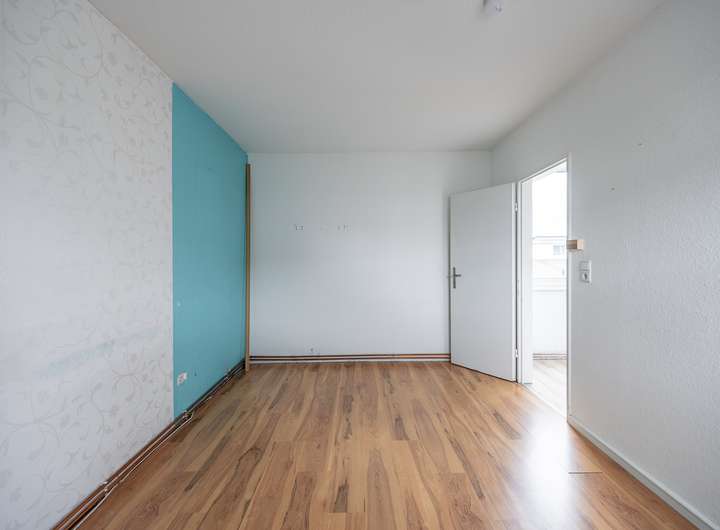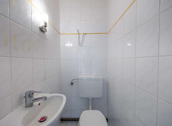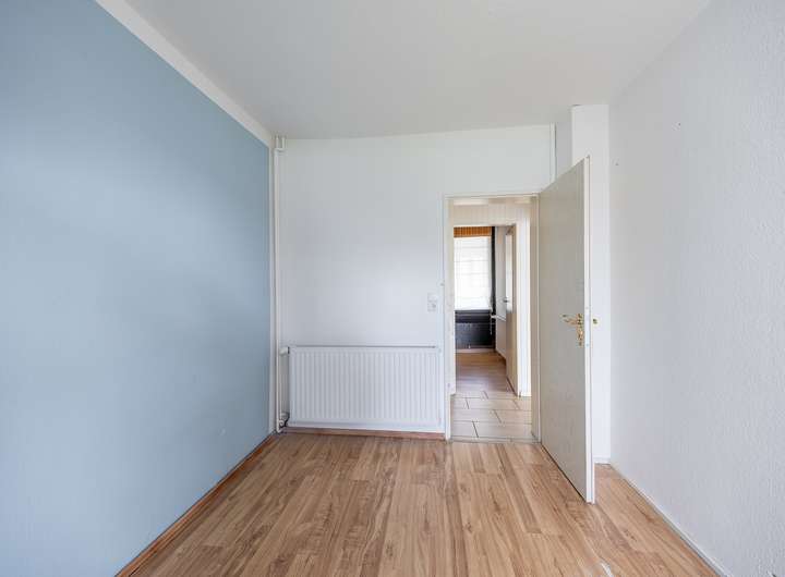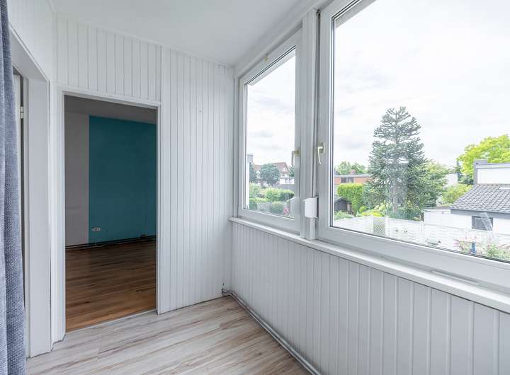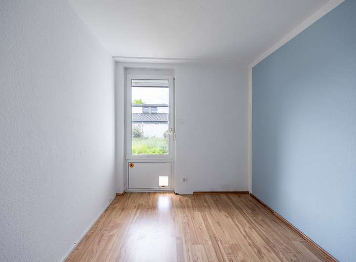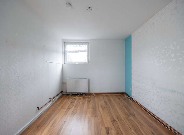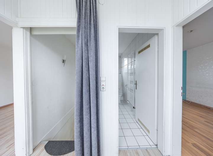 Ein kleiner Zwischenflur führt zu zwei weiteren Zimmern im Erdgeschoss sowie einem innenliegenden Gäste-WC. Das Obergeschoss beherbergt zwei weitere Zimmer und ein schmales Tageslichtbad mit Eckwanne – funktional gelöst, aber in die Jahre gekommen und ideal für eine umfassende Sanierung geeignet.