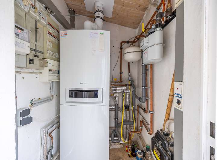 Beim Betreten empfängt Sie ein heller Flur. Zur Rechten liegt der Heizungsraum mit moderner Buderus-Gasheizung von 2017 und modernisierter Elektrik. Zur Linken wartet der helle großzügige Wohn-Essbereich mit Kamin und Zugang zur großen Terrasse mit elektrischer Pergola. Die angeschlossene Küche verfügt über einen Abstellraum und eine ältere, funktionale Einbauküche.