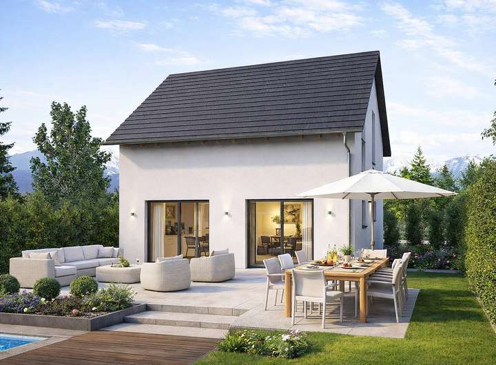 Schlichte Eleganz gepaart mit einem durchdachten Raumkonzept - das zeichnet das Einfamilienhaus Design 9.2 aus. Die geradlinige Architektur wird noch unterstrichen durch die zweifarbige Fassadengestaltung, die dem Haus eine besondere Note verleiht und sie optisch noch einmal zusätzlich aufwertet. Geradlinig geht es auch im Inneren weiter. Herzstück im Erdgeschoss ist der große und lichtdurchflutete Wohn-Ess-Koch-Bereich mit direktem Zugang zum Garten. Dieser ist räumlich getrennt von Hauswirtschaftsraum und Gäste-WC. Von der geräumigen Diele, in der ausreichend Platz für eine Garderobe ist, führt eine Treppe ins Obergeschoss. Hier wird der Wohnraum perfekt ausgenutzt. Zwei Kinderzimmer, ein Schlafzimmer für die Eltern sowie ein geräumiges Bad mit Wanne, Dusche und WC bieten hier einen idealen Rückzugsort. Auf einer Wohnfläche von rund 107 m² ist hier ein gemütlicher und komfortabler Wohlfühlort für die ganze Familie entstanden.