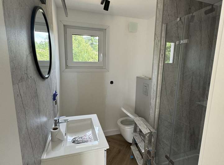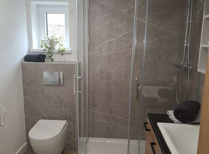 Modernes, helles Badezimmer mit bodengleicher Dusche, Fenster und hochwertiger Sanitärausstattung. Das Design wird Ihren Wünschen angepasst.