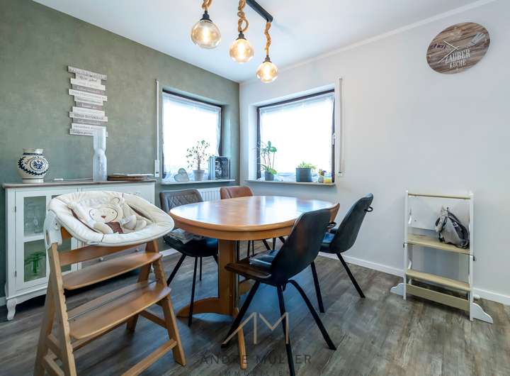 Auf rund 98 m² Wohnfläche, insgesamt etwa 124 m² Nutzfläche, verteilt sich ein sinnvoll geschnittener Grundriss. Der helle Wohn und Essbereich mit Blick in den Garten ist ganz klar der Mittelpunkt. Hier spielt sich der Alltag ab, vom gemeinsamen Essen bis zu entspannten Abenden auf der Couch. Draußen wartet der sonnige Garten mit überdachtem Freisitz. Ob Grillabend im Sommer oder ein geschützter Platz an kühleren Tagen, das fühlt sich ein bisschen wie Urlaub zu Hause an.