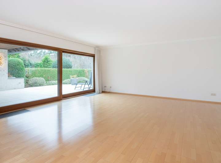 Sie betreten die Immobilie durch eine Eingangsdiele mit Garderobe und Gäste-WC. Von hier gelangen Sie auch in das Kellergeschoss. Durch ein Durchgangszimmer, auch als Kaminzimmer zu bezeichnen, erreichen Sie den großen und hellen Wohn-/Essbereich mit seinen bodentiefen Fenstern und genießen von hier den Blick auf die Terrasse und in den sehr schön angelegten Garten mit Fischteich und Freisitz. Die geschlossene Küche grenzt an den Essbereich, lässt sich aber auch mit einfachen Mitteln umwandeln für Freunde einer offenen Küche.