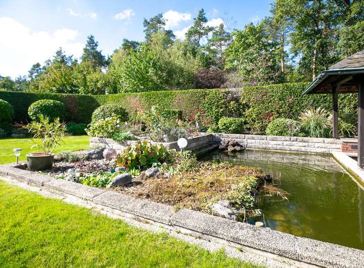 Ein weiteres High-Light ist der sehr schön angelegte und nicht einsehbare Garten mit seinem Fischteich und Freisitz. Am Freisitz befindet sich außerdem ein gemauerter Grill, sodass Grillfreunde durchaus darüber nachdenken können, dies um eine kleine Outdoor-Kitchen zu erweitern.