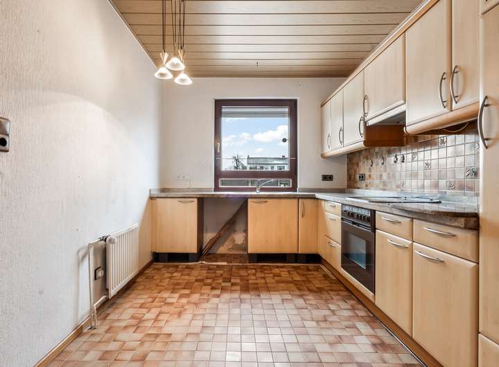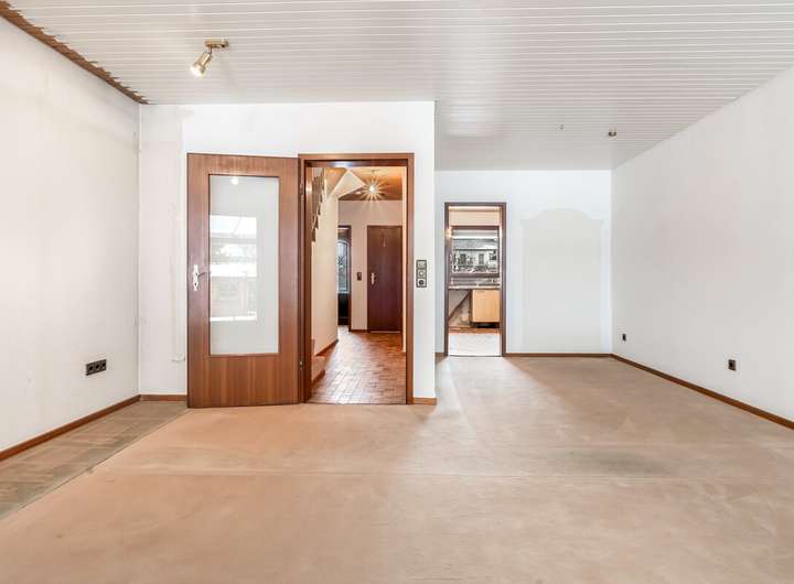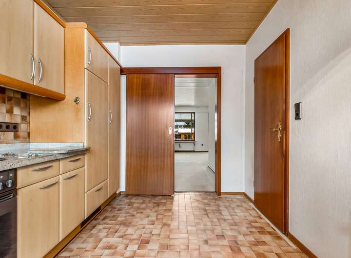 Innen öffnet sich der Blick: ein Wohn- und Essbereich, der mit der Terrasse spricht, mit dem Garten und mit den Möglichkeiten. Das Licht kommt von hinten, warm und weich. Wer hier ankommt, kann bleiben. Nebenan: eine Küche, funktional und geräumig.