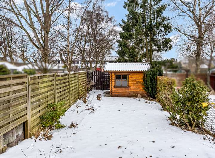 Eine Garage gehört auch dazu, nur ein paar Schritte entfernt. Und im Garten ein Häuschen aus Holz – zurückhaltend wie das ganze Ensemble. Es steht einfach da, bereit für Geräte, Räder oder stille Pläne.