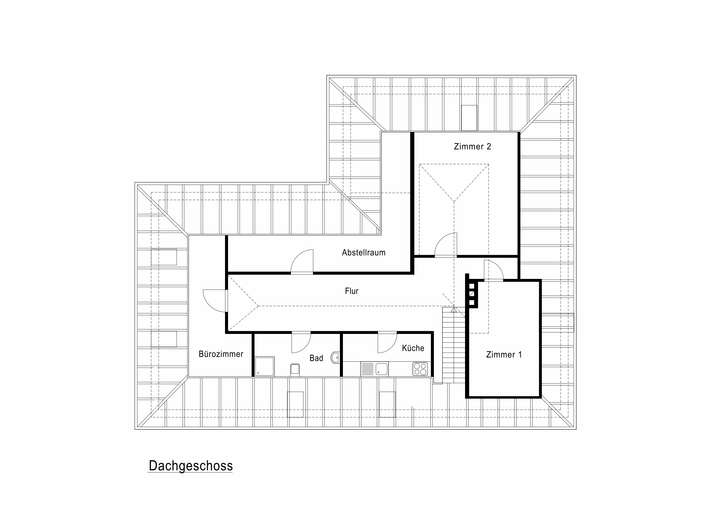 Über eine Holztreppe geht es in das Dachgeschoss mit 3 Zimmern, Küche und Bad.