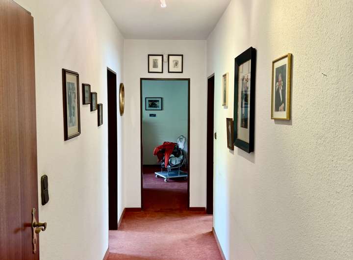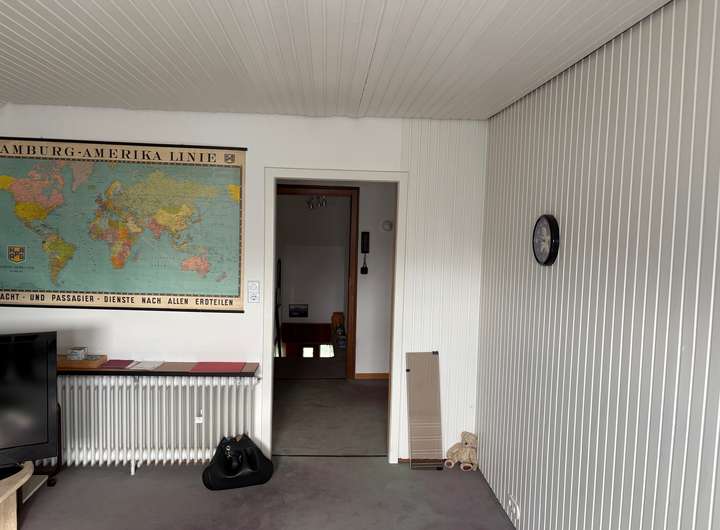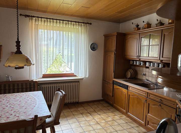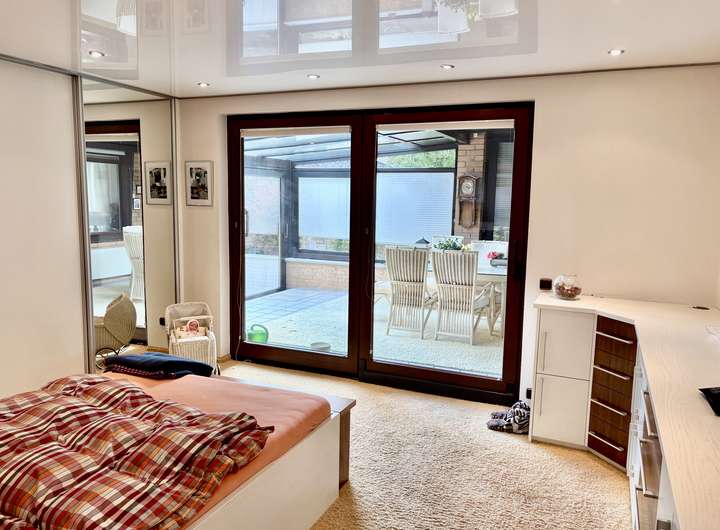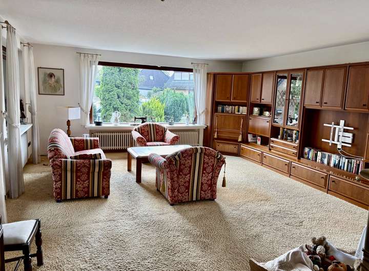 Doch dazu später mehr – zunächst betritt man das Erdgeschoss des Hauses über den sehr schön eingewachsenen Bereich hinter der Garage. Hier finden sich u.a. ein großes, helles Wohnzimmer mit ca. 41 qm, das in der heutigen Zeit eher selten zu finden ist. Dazu führt der Weg über die Diele in 2 geräumige Schlafzimmer und 2 weitere Räume, die sowohl als Kinderzimmer oder auch als Arbeitszimmer dienen können. Die separate Küche mit Essplatz erweist sich im Alltag als nützlich.