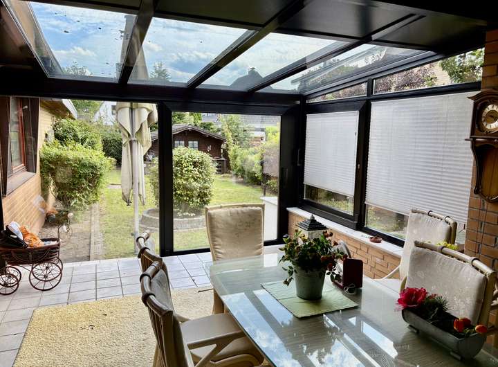 Erwähnenswert erscheint zudem der hochwertig errichtete Wintergarten mit einer Schiebeanlage, der Schutz bietet, sollte das Wetter einmal nicht mitspielen. Der Wintergarten ist sowohl aus dem Wohnzimmer als auch aus einem der Zimmer begehbar.