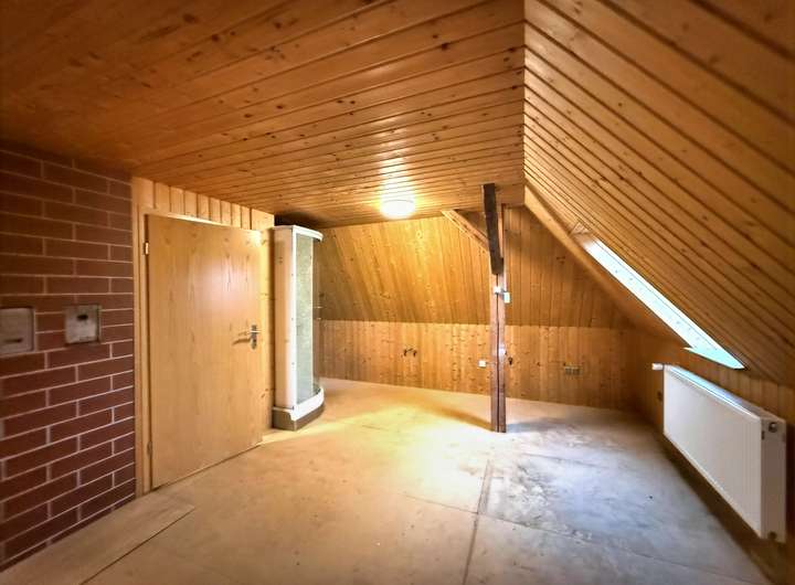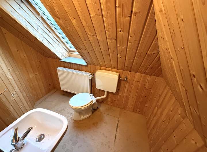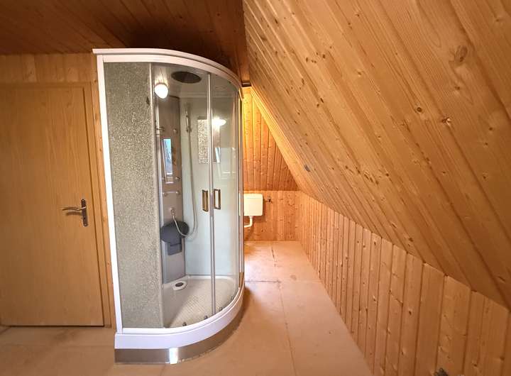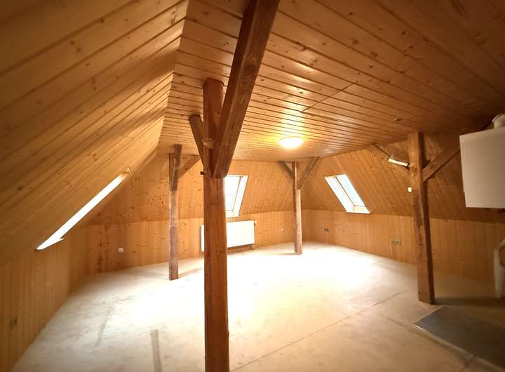 Im Dachgeschoss ist ein großes Studio und in einer Ecke wurde eine Dusche mit WC abgetrennt.