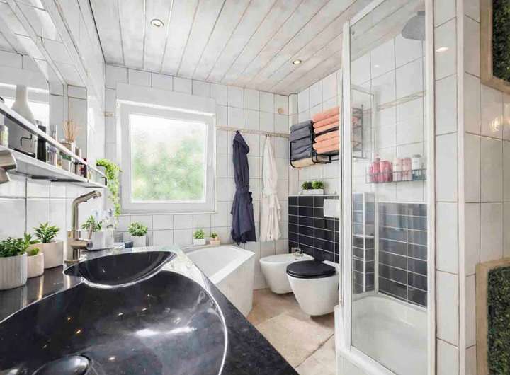 Das Badezimmer im Erdgeschoss präsentiert sich modern, gepflegt und zeitlos. Klare Linien, eine funktionale Gestaltung und ein angenehmes Raumgefühl sorgen für Komfort im täglichen Gebrauch – ein wichtiger Aspekt für Familien.