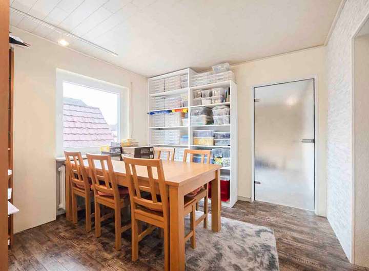 Der Wohn- und Essbereich präsentiert sich einladend und harmonisch. Große Fensterflächen sorgen für eine natürliche Belichtung und schaffen ein freundliches, luftiges Raumgefühl. Hier spielt sich das Leben ab: gemeinsames Essen, Gespräche, entspannte Abende und lebendige Familienzeit.